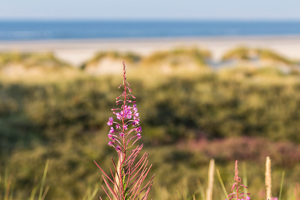 In den Ostdünen gibt es zahlreiche Stellen, an denen das Schmalblättrige Weidenröschen wächst, das den Dünen rosa Farbtupfer verleiht.