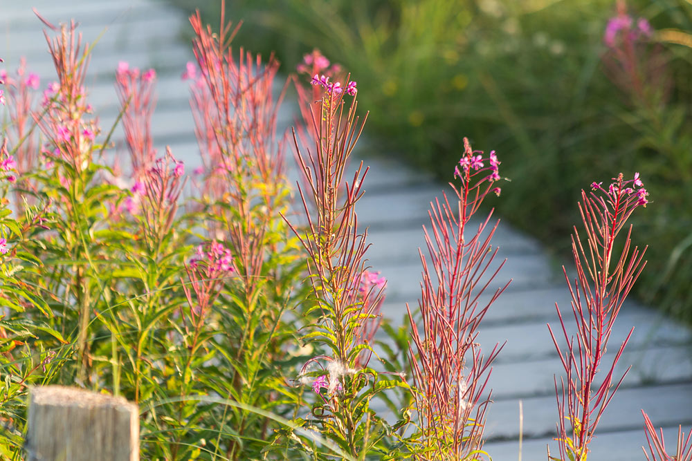 Zahlreiche Schmallblättrige Weidenröschen wachsen entlang der Dünenüberwegung Ost I, an der sich auch die Aussichtsplattform befindet.