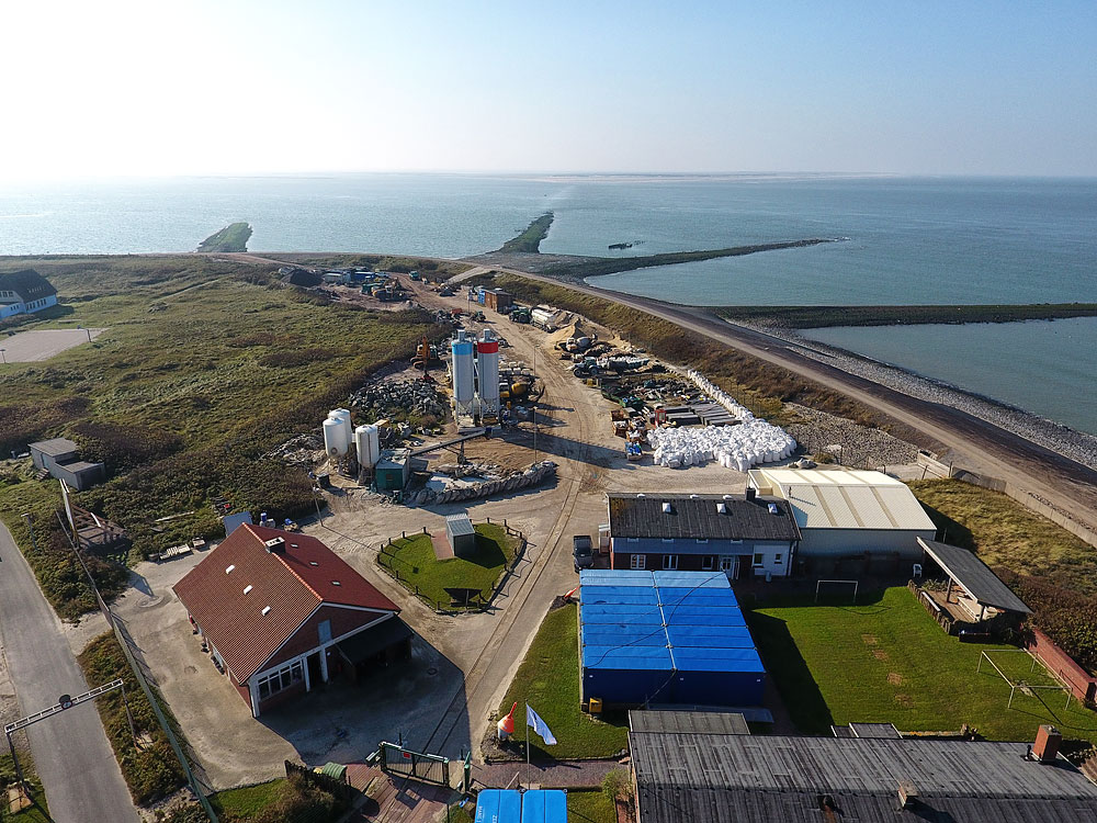 Der Bauhof des WSA von Osten her gesehen. Aufgrund der Deckwerksarbeiten lagert mehr Material als gewohnt auf dem Platz, auch wurde ein kleines Containerdorf aufgestellt.