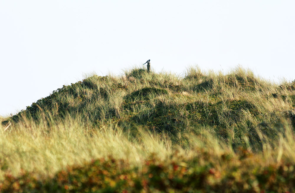 Einen guten Rundumblick hat diese Elster von ihrem Standort auf einem Pfahl oben in den Ostdünen aus.