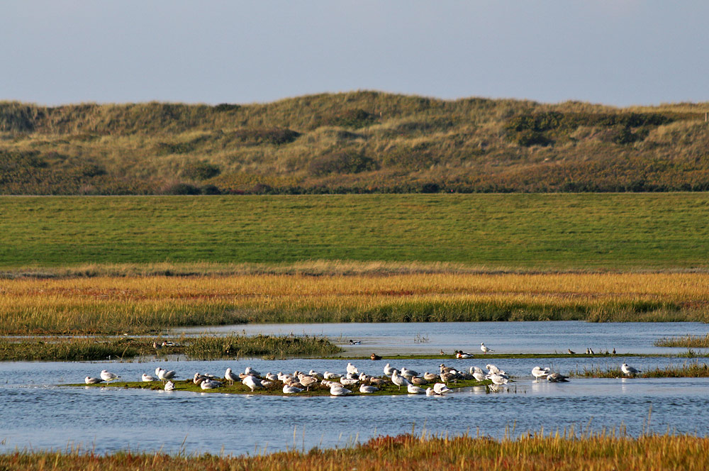 Der Westaußengroden mit seinen zahlreichen Prielen gehört zur Ruhezone des Nationalparks Niedersächsisches Wattenmeer. Unten sehen wir einige Möwen, die auf einer kleinen Insel inmitten der Salzwiesen rasten, auch ein paar Brandgänse sind dabei.