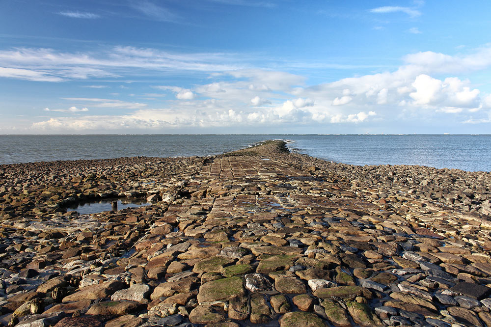 Die Buhne B zeichnet sich dadurch aus, dass sie an einer Stelle deutlich verbreitert ist. Hier befand sich einst, bis zu seiner Sprengung 1914, das Fundament des Alten Westturms.