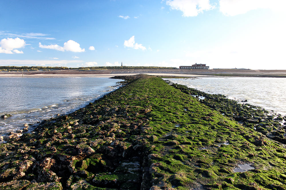 Bei Niedrigwasser gelangt man auf der 340 Meter langen Buhne B recht weit nach Norden, das Deckwerk scheint in weite Ferne gerückt.