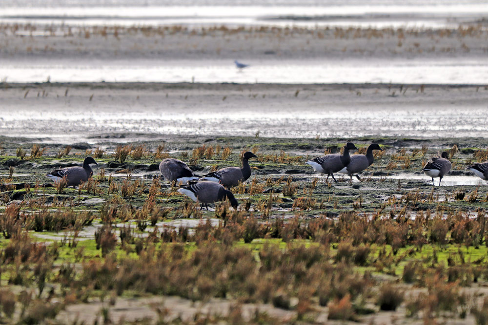 Einige Ringelgänse haben sich in der Quellerzone am Rande des Wattenmeers zur Nahrungssuche zusammen gefunden.