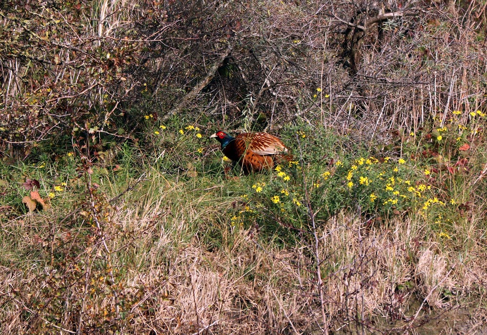 Geduckt sitzt ein farbenfroher, männlicher Fasan in den Ostdünen.