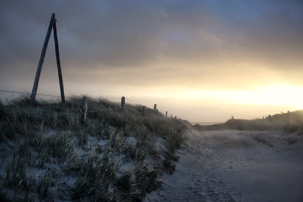 Wir überqueren soeben die Dünenüberwegung Neudeich, auch hier wird noch kräftig Sand durch die Luft gewirbelt.