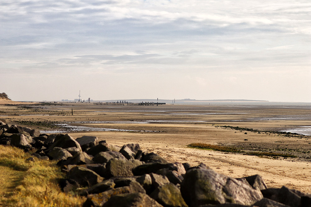 Von hier bis zum Ostende ist es noch ein Stückchen, hinten ist aber bereits gut der ehemalige Ostanleger zu sehen, dahinter die Blaue Balje und am Horizont die Insel Minsener Oog.
