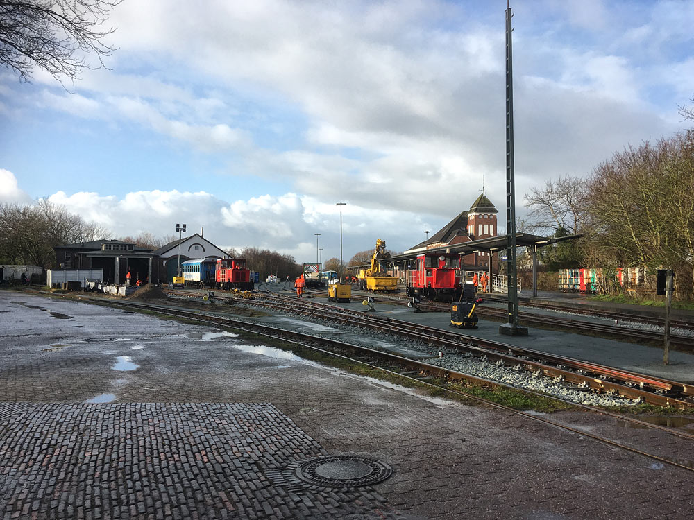 Max Maulwurf auf der Insel: In einer großen Bauaktion werden im Herbst 2019 im Bereich des Bahnhofs bzw. des Lokschuppens so gut wie alle Gleise erneuert. Hierzu ist eine Spezialfirma mit mehreren Baufahrzeugen vor Ort.