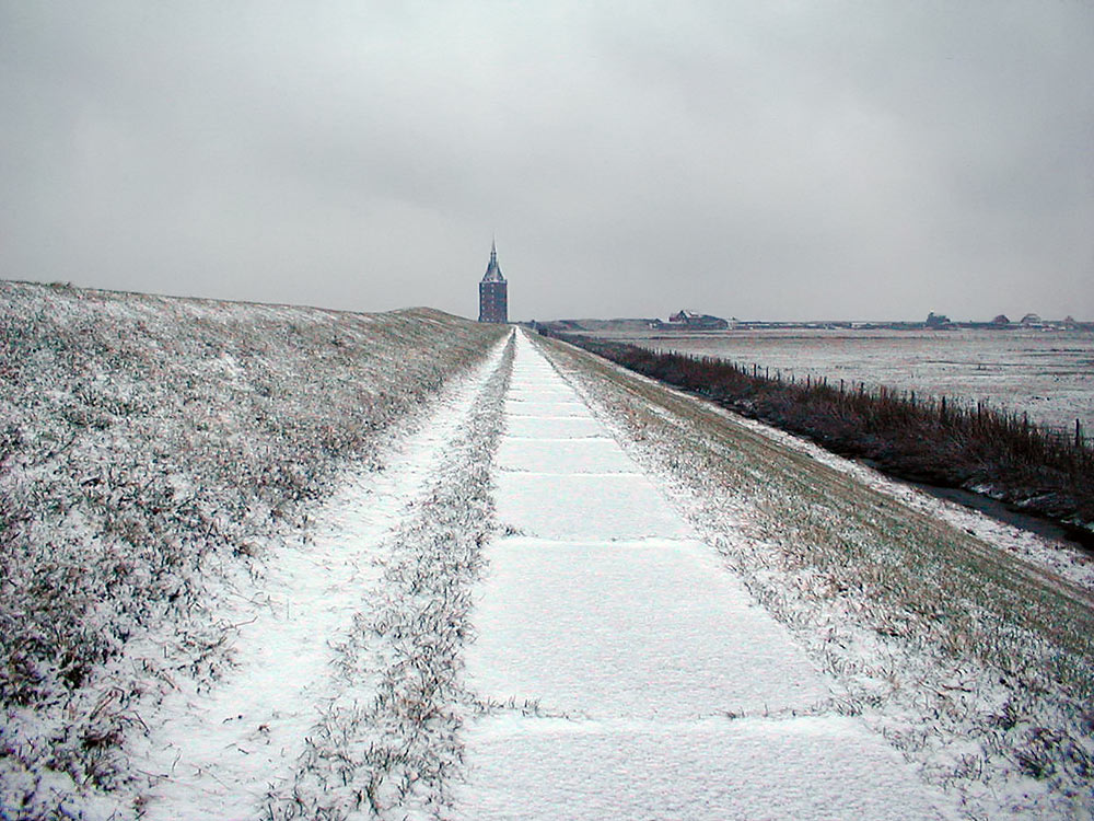 Hier befinden wir uns auf dem alten Deichkronenweg des Westgrodendeichs, der auch nach der Deicherhöhung noch besteht. Er führt geradewegs zum Westturm, vorbei am Deichgraben und an den Weiden des Westinnengrodens.