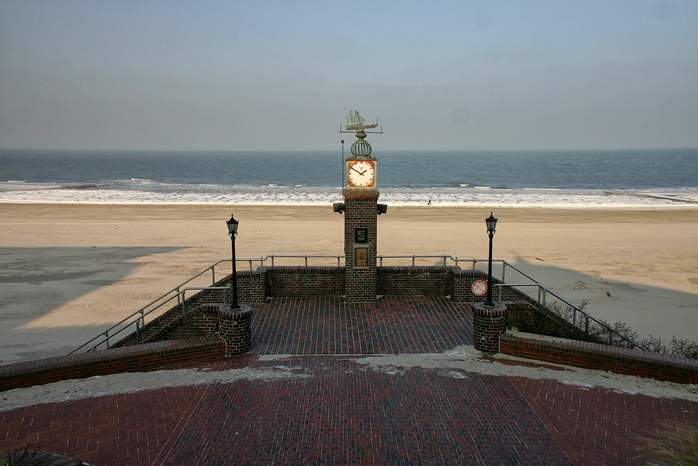 Nördlich vom Pudding führt eine denkmalgeschützte Treppe hinunter zur Strandmauer. Aufgrund der niedrigen Temperaturen hat sich an der Wasserkante eine Eisschicht gebildet, die von hier oben aus als weiße Fläche erkennbar ist.