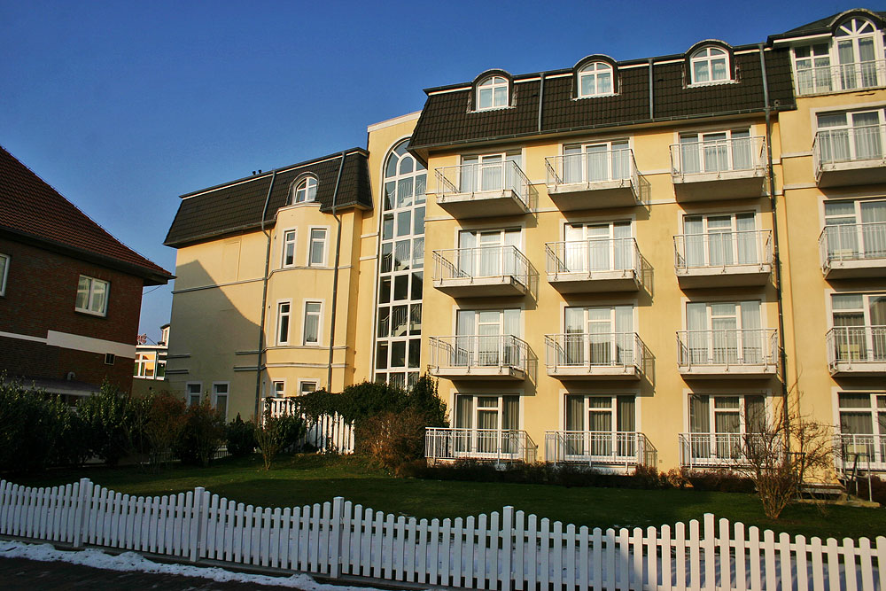 Deutlich seltener als die Vorderseite wird die Rückseite des Upstalsboom Strandhotels Gerken abgelichtet. Zwar haben die südseitigen Zimmer keinen Meerblick, dafür aber große Fenster und sogar Balkons.