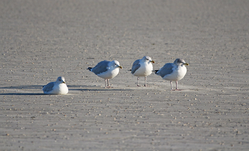 Eine kleine Gruppe Silbermöwen sitzt am Oststrand, immer mit Blick nach Luv.