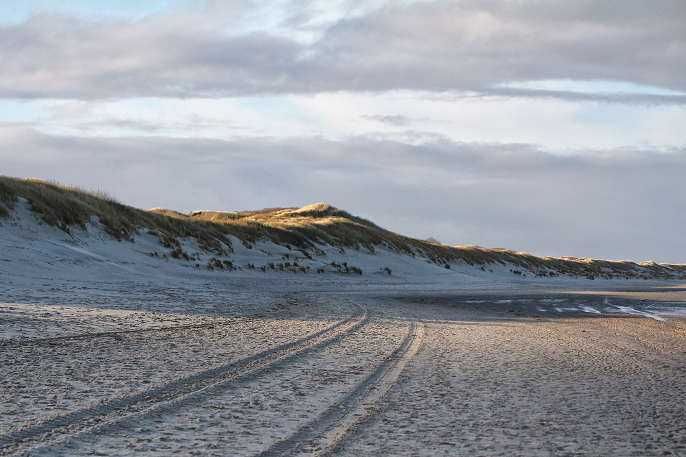 Fast am Ostende angekommen, wird noch einmal kurz zurück geblickt. Links die Ostdünen, die im Winter lange Schatten an den Strand werfen.