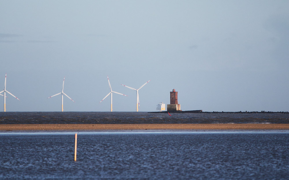 Vom Oststrand aus in Richtung Leuchtturm Minsener Oog Buhne A geblickt. Beim Turm handelt es sich um einen ehemaligen Flakturm, der später als Leuchtturm diente. Links einige Windräder des Windparks Nordergründe.