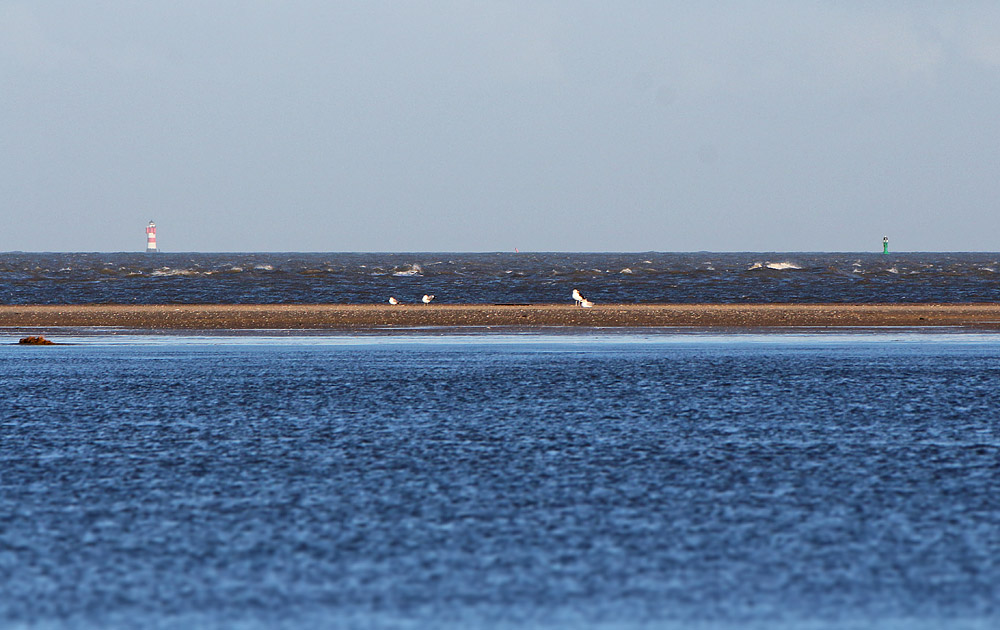 Je näher man zum Ostende kommt, desto breiter wird der Strand. Dort ist auch ein ausladender, flacher Priel zu finden, der manchmal mehr oder weniger trocken fällt. Haben Sie außerdem den Leuchtturm Roter Sand am Horizont bemerkt?