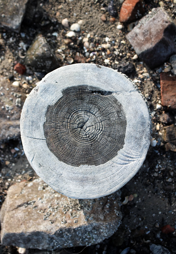 ‹ Verwitterte Jahresringe zeichnen sich an diesem uralten Holzpfahl, der einst die Schlengenbude nahe der Ostbake trug, ab.
