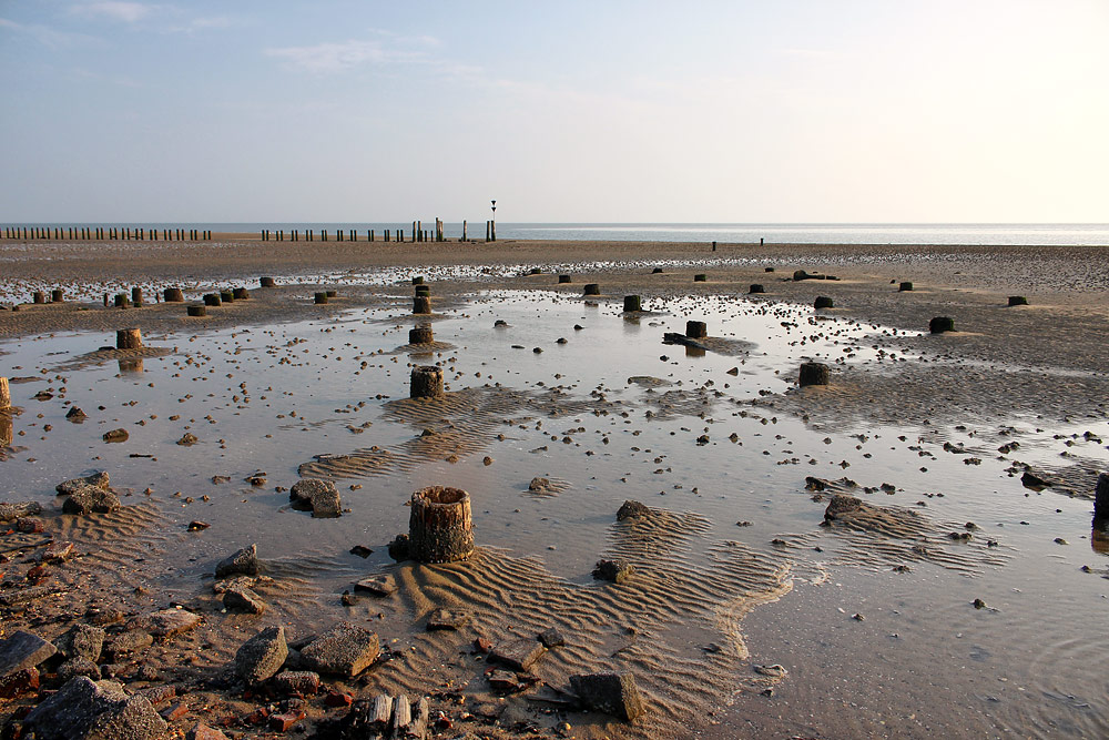 Die Pfahlreste, die hier im Inselosten aus dem Boden ragen, gehören einmal zur damaligen Schlengenbude (vorn), aber auch zur ehemaligen Ostbake (hinten zu erkennen).