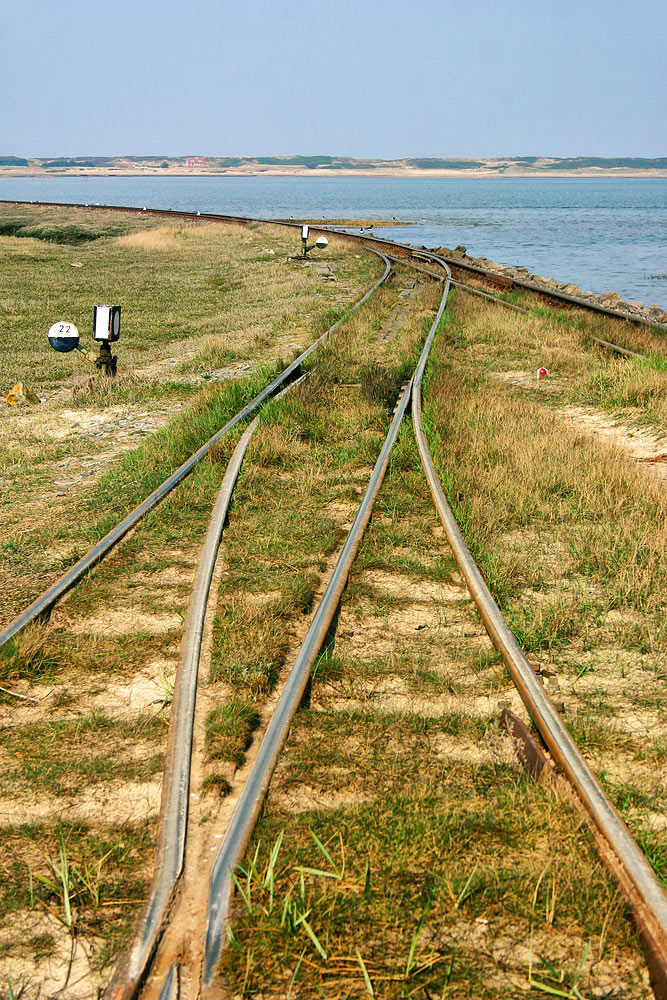 ‹ Mittels zweier Weichen werden die Gleise des Westanlegers hier zu einem einzigen vereinigt, denn die Strecke zwischen Anleger und Dorf ist lediglich eingleisig.