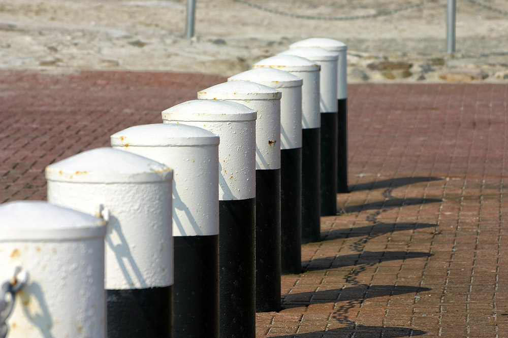 Links und rechts der Rampe, an der für gewöhnlich das Frachtschiff anlegt, stehen in dichten Abständen schwarz-weiße Poller, die nicht zu übersehen sein dürften.