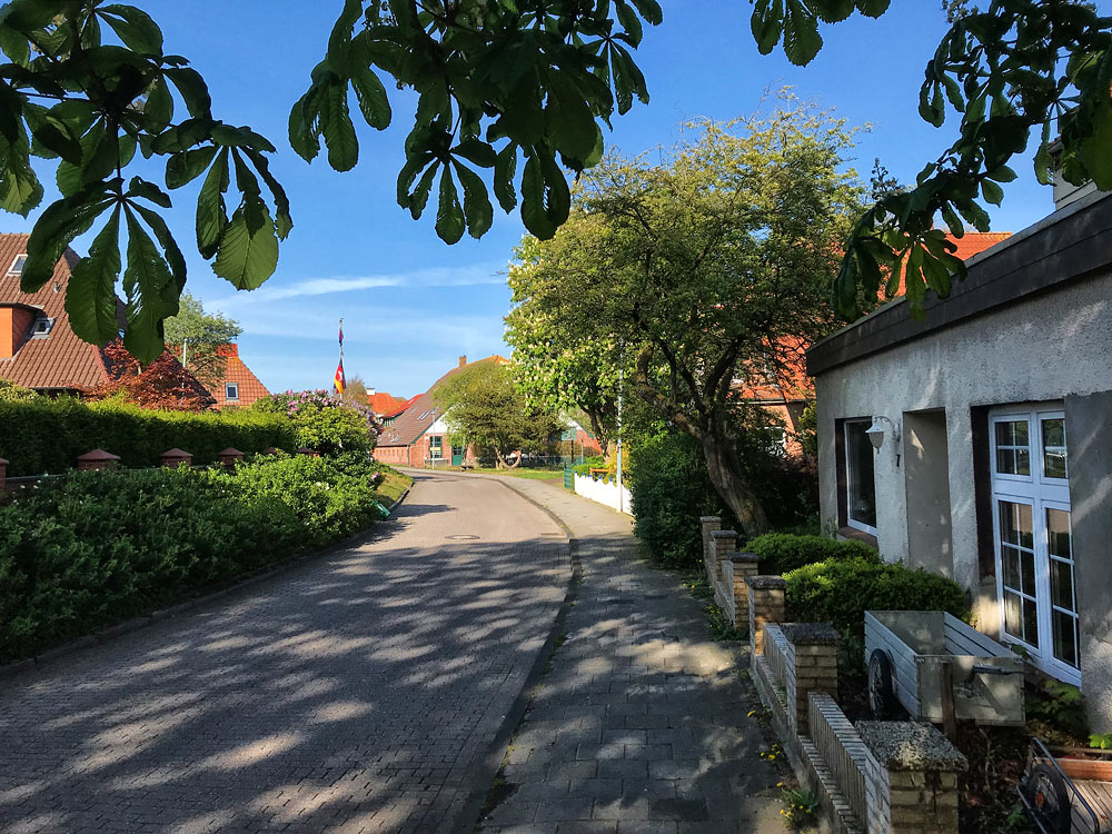 Wir sind gerade im Inseldorf unterwegs und befinden uns hier mitten in der Rösingstraße. Im Hintergrund in der Bildmitte ist der Ponyhof zu erkennen.