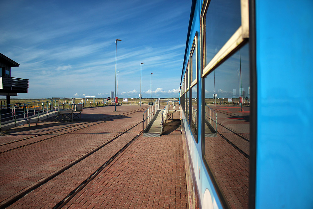 Angekommen am Westanleger, heißt es nun warten auf die Weiterfahrt mit der Inselbahn. In den Fenstern des Personenwagens spiegelt sich der Anleger mit den Bahngleisen, von denen das mittlere übrigens nicht nutzbar ist.
