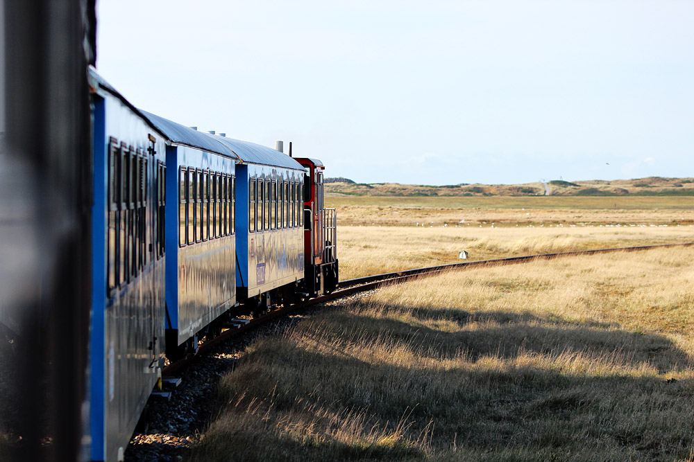 Fahrt mit der Wangerooger Inselbahn durch die Salzwiesen-Landschaft des Westgrodens.