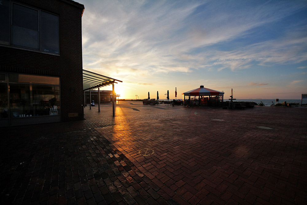Ein abendlicher Blick auf den menschenleeren Platz am Meer mit der Schirmbar, dem Digger's Außenposten.