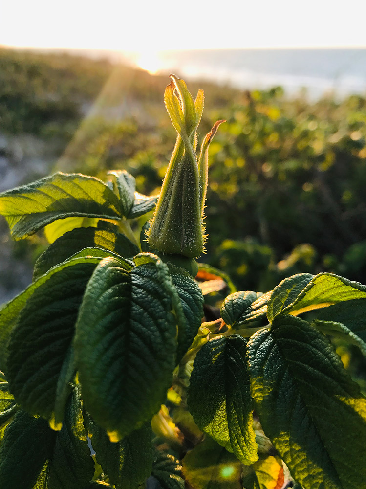 ‹ Eine Blütenknospe der Kartoffelrose im abendlichen Gegenlicht.