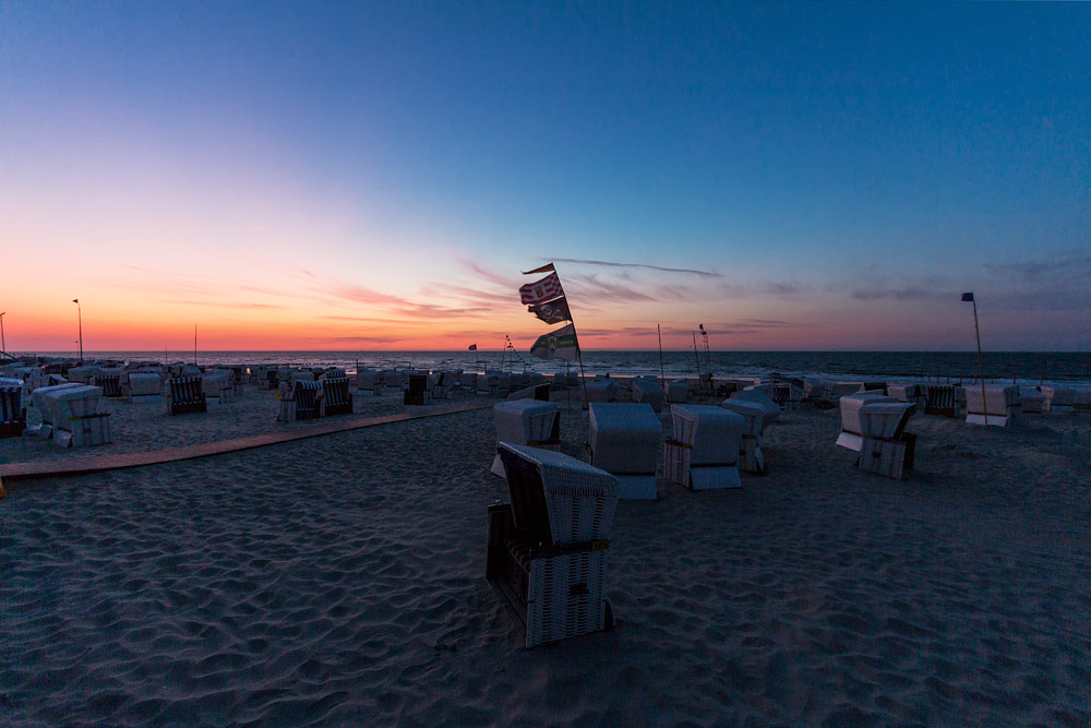 Westfeld-Strandkörbe in der Abenddämmerung.