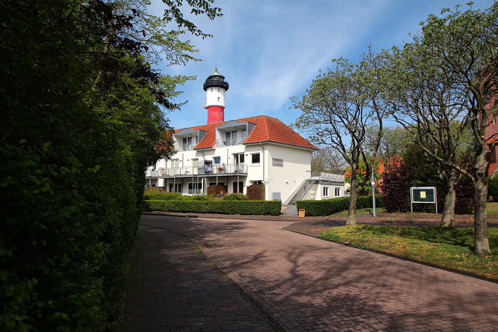 Geradeaus erkennt man die Residenz zur Börse, die sich in der Bahnhofstraße unweit des Leuchtturms befindet. Einst gab es hier auch eine Gaststätte, die für ihre halben Hähnchen nicht nur inselweit, sondern weit darüber hinaus bekannt war.
