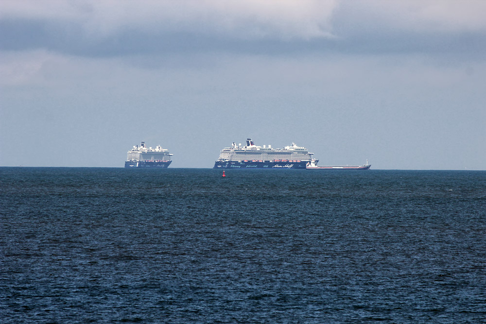 Die »Mein Schiff 4« und die »Mein Schiff 6« liegen zum Zeitpunkt der Aufnahme Anfang Mai 2020 Corona-bedingt vor Wangerooge auf Reede. Beide Schiffe sind jeweils knapp 300 Meter lang, fassen gut 2500 Passagiere und haben je 625 Millionen US-Dollar gekostet.