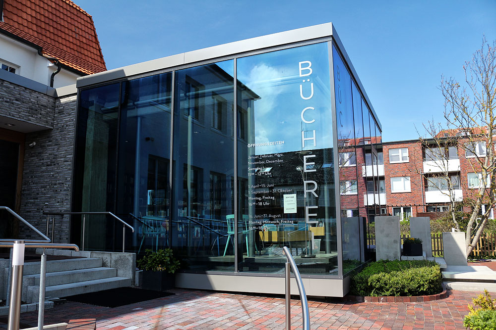 Im Haus Ansgar am Damenpfad befindet sich die katholische Gemeindebücherei. Im Zuge einer umfassenden, neunmonatigen Umbau-Maßnahme erhielt das Gebäude 2018 diesen schicken, lichtdurchfluteten Glas-Anbau.