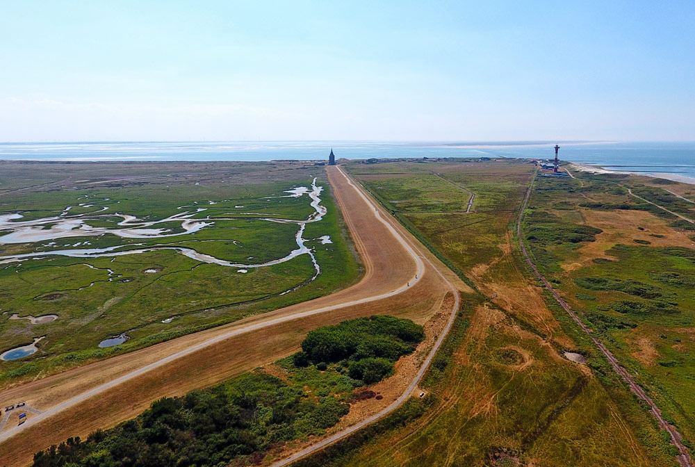 Links der Westaußengroden mit der Lagune, rechts der Westinnengroden mit Weiden und der Inselbahn-Strecke ins Westdorf, dazwischen der Westgrodendeich, dessen Gras sich im trockenen Sommer 2018 komplett braun gefärbt hat.