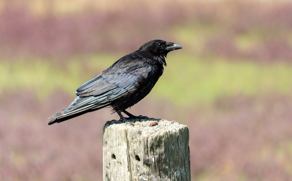 Eine Rabenkrähe sitzt auf einem Pfahl am Rande der Weiden im Dorfgroden.