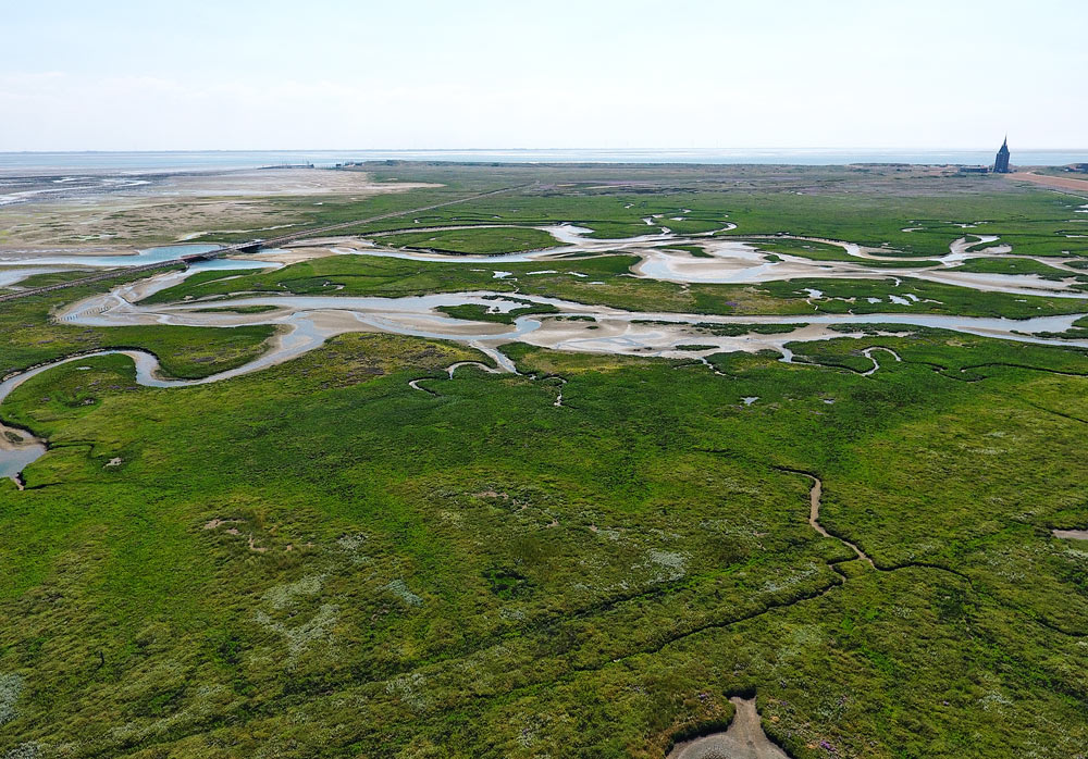 Ein ganz besonders beeindruckendes Bild geben die Salzwiesen und Priele des Westaußengrodens aus der Luft ab.
