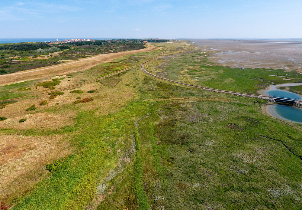 Etwas oberhalb der Bildmitte treffen die beiden Strecken der Inselbahn, die zum Westanleger (rechts) bzw. ins Westdorf (links) führen, aufeinander. Schwach erkennt man anhand des Bewuchses auch noch, wo sich einst das dritte Gleis des Gleisdreiecks befand, es führte vom Westanleger direkt zum Haltepunkt im Westdorf, ohne daß gewendet werden mußte.
