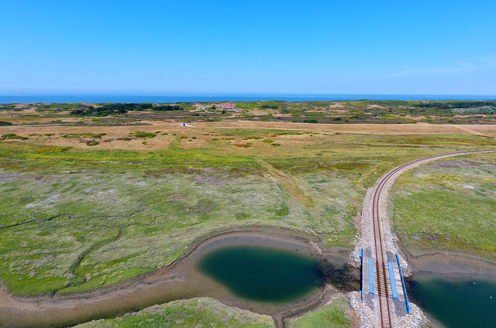 Am unteren Bildrand sieht man noch einmal deutlich die Aalkuhlen, die sich see- und landseitig der Prielbrücken befinden. Einst angelten Insulaner gerne darin und brachten so manchen leckeren Fisch wie beispielsweise Plattfische oder die namensgebenden Aale nach Haus.