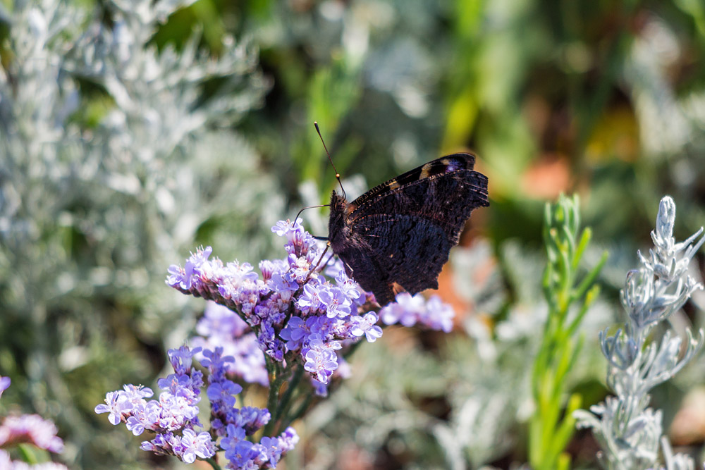 Ein Tagpfauenauge hat sich auf den Blüten des Strandflieders niedergelassen. Rechts und im Hintergrund erkennt man außerdem den silbrig-grünen Strandbeifuß, der den Schmetterling aber eher weniger interessiert.
