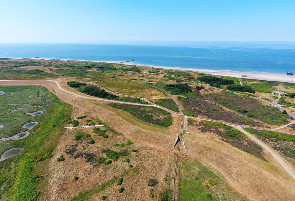 Dort unten geht der Westgrodendeich in den Süddeich über, auch ein Deichschart für die Inselbahn befindet sich dort. Ganz links im Deichvorland erkennt man einige Bombentrichter, ganz rechts das Inselgasthaus Jan Seedorf.