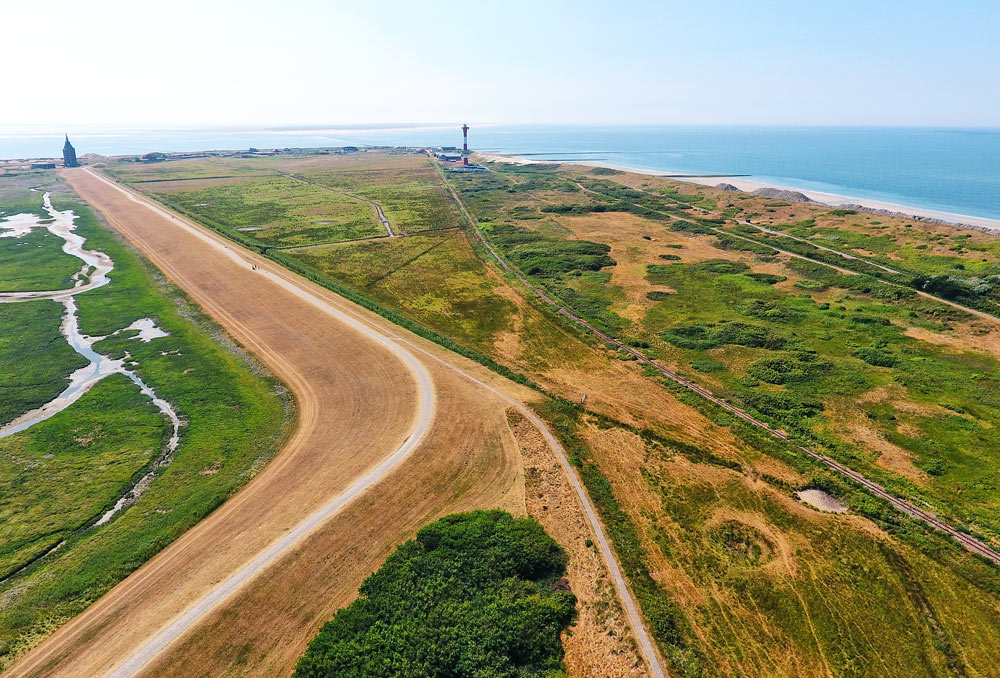 Hier noch einmal der Westinnengroden aus der Luft gesehen. Er befindet sich zwischen dem Westgrodendeich, der links zu sehen ist und den Nordwestdünen (rechts). Während im Sommer Kühe grasen, sind im Winterhalbjahr dort umso mehr Zugvögel anzutreffen.