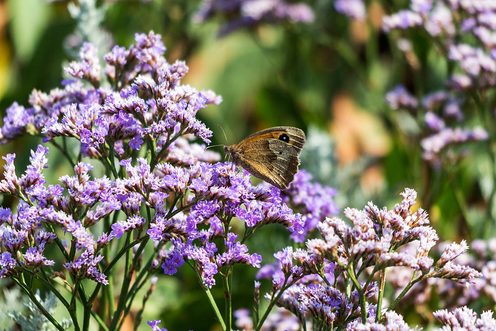 Der Strandflieder in den Salzwiesen bekommt hier gerade Besuch vom Großen Ochsenauge, das mit seinem Augenfleck gut zu identifizieren ist.
