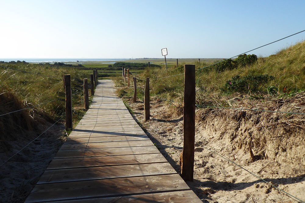 Erst kürzlich wurde die Dünenüberwegung komplett erneuert, sie befindet sich in etwa nördlich von dem Punkt, an dem die Straße und der Fußweg zum Westen kurz aufeinander treffen.