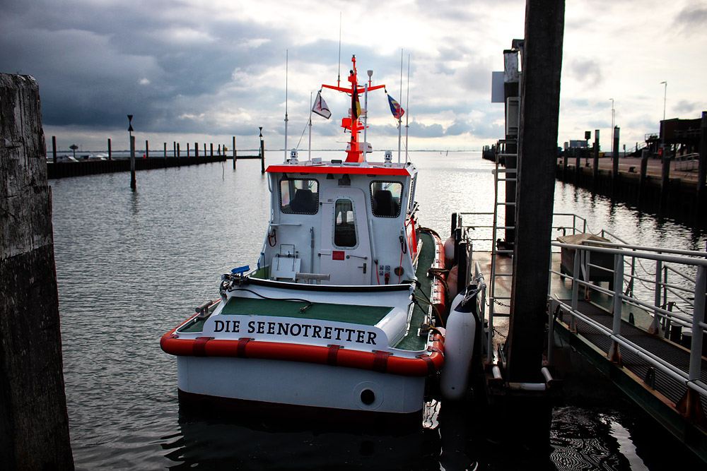 Das Rettungsboot der DGzRS liegt hier an seiner Anlegestelle, einem Schwimmsteg im Hafenbecken des Wangerooger Westanlegers.