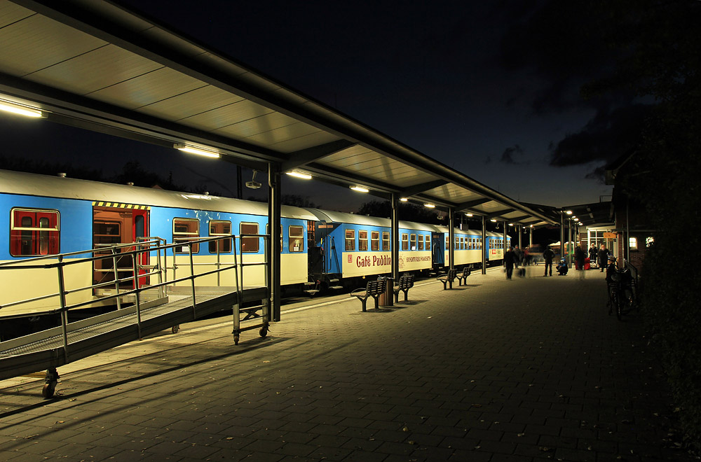 Noch ist Licht in den Wagen der Inselbahn, denn der Zug ist erst vor Kurzem am Bahnhof Wangerooge eingetroffen. Im Hintergrund warten einige Personen darauf, ihr Gepäck in Empfang nehmen zu können.