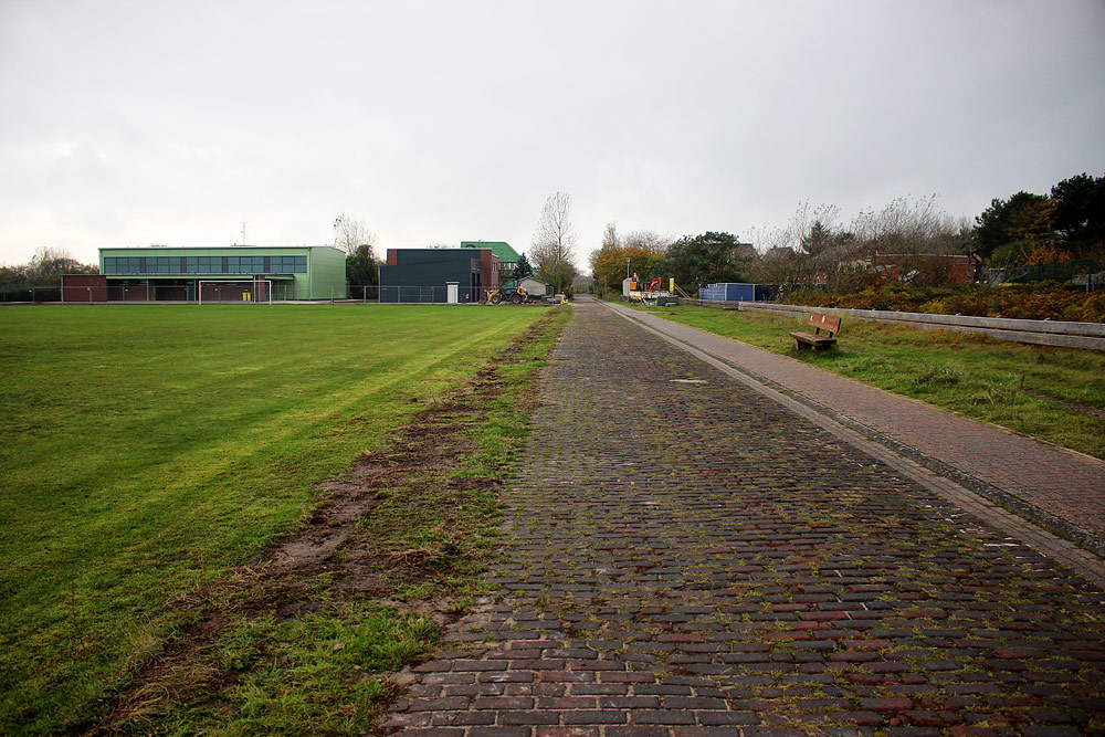 Die neue Sporthalle und die Rettungswache im Hintergrund sind fast fertig. Davor erkennt man den Fußballplatz, der in Kürze zur Straße hin eine neue Umzäunung erhalten wird. Ebenfalls erneuerungsbedürftig ist der Belag der Siedlerstraße, doch bislang wurde vor einigen Jahren lediglich ein Bürgersteig angelegt.