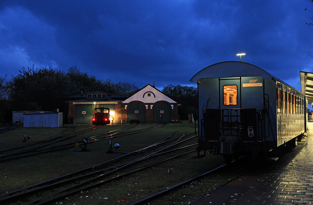 Dies war die letzte Zugankunft des Tages, für die Bahn-Mitarbeiter naht der verdiente Feierabend. Links wird gerade schon die Schöma-Lok in den Lokschuppen gefahren.