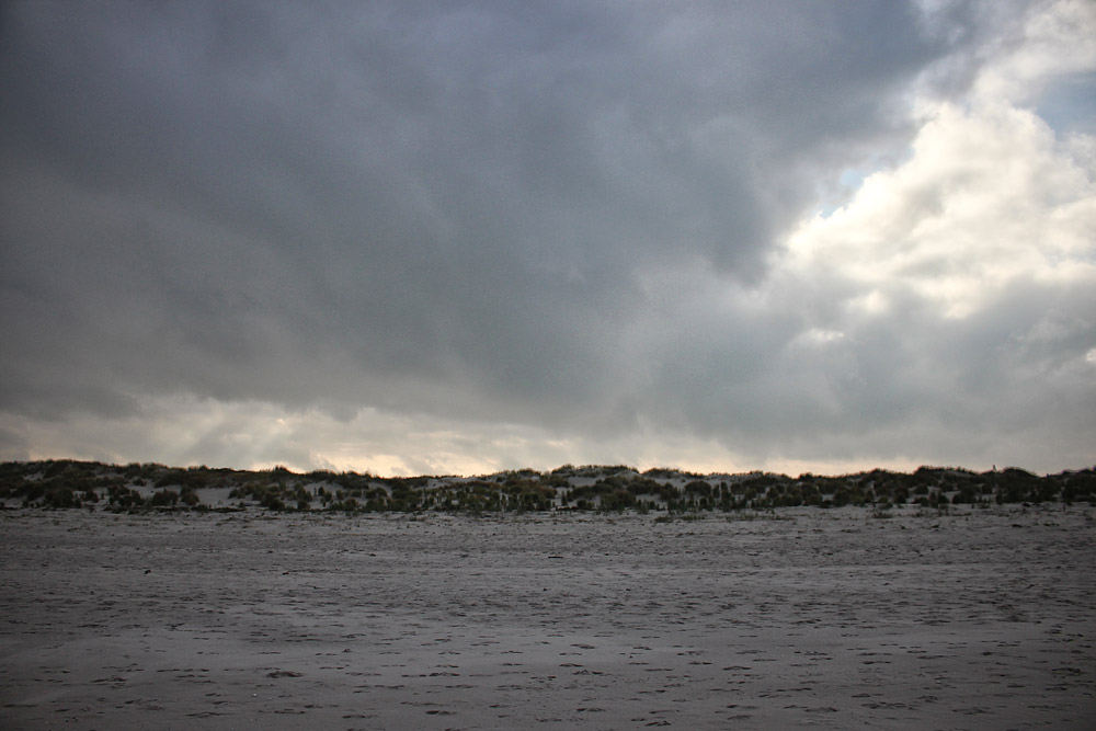 Strandspaziergang am Nordoststrand. Am Himmel begleiten uns dicke Regenwolken, während wir vom Strand aus in Richtung Dünenkette blicken.