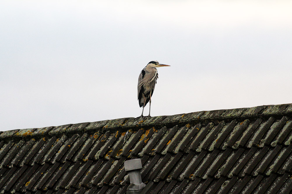 Ein Graureiher hat sich hier mitten im Inseldorf auf einem Dachfirst niedergelassen.