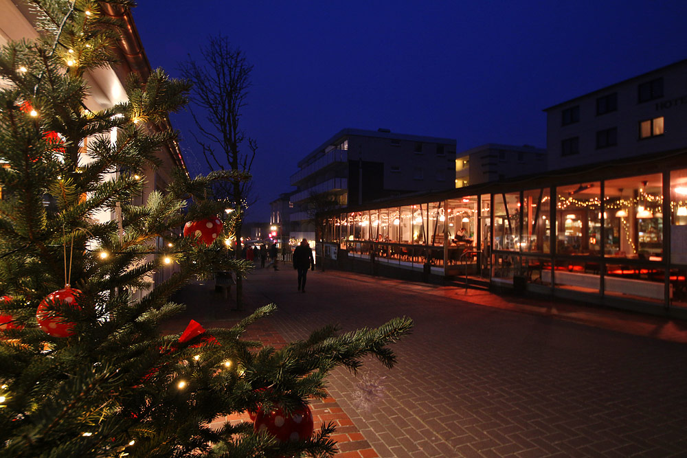 Ein Weihnachtsbaum mit rot-weißen Kugeln ziert den Eingangsbereich der Inselbuchhandlung und auch der Wintergarten des Hotel Hanken ist weihnachtlich geschmückt.