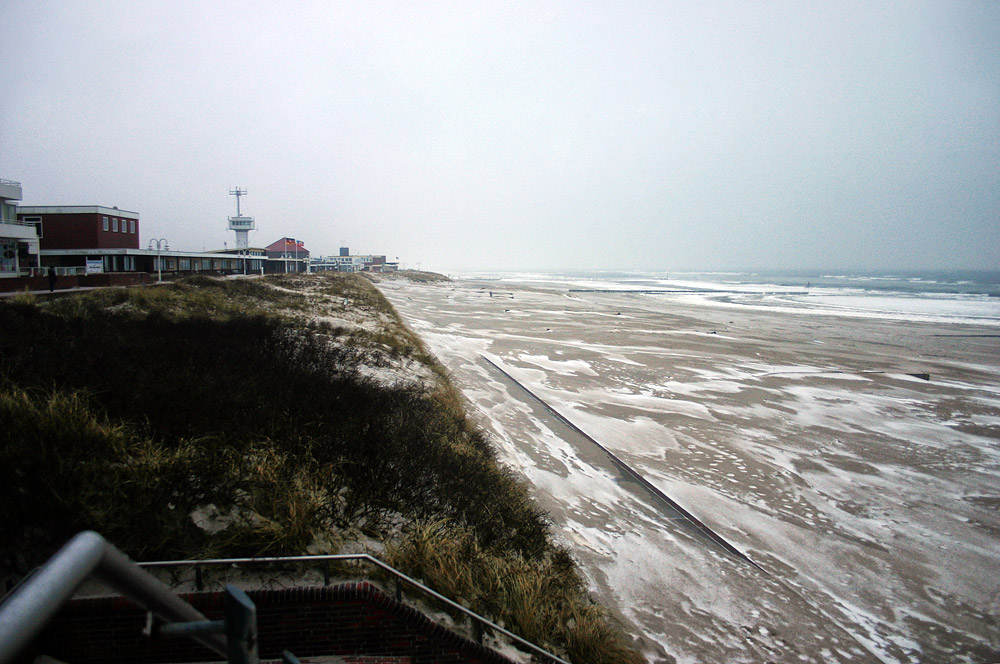 Es herrscht naßkaltes Wetter auf Wangerooge mit Schnee und Wind.